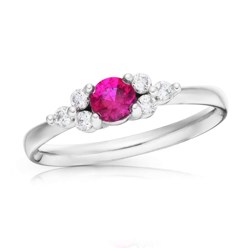 Prsten Suzanne z bílého zlata s centrálním červeným rubínem a diamanty bríliantového brusu. Prsten vám rádi vyrobíme na zakázku i v jiných barvách zlata.