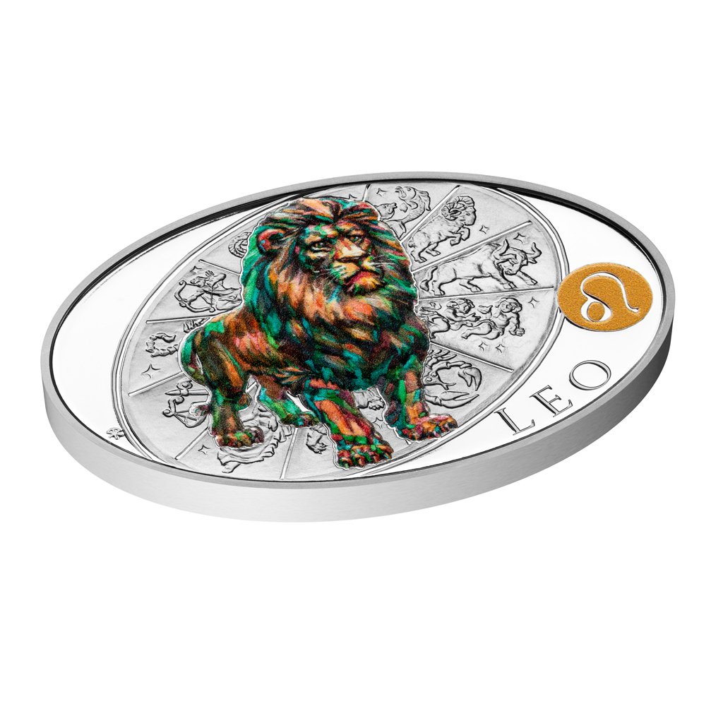 Medaile netradičního oválného tvaru nese na averzní straně kolorované vyobrazení Lva. Jako předloha pro kolorování nebyly použity fotografie nebo počítačová grafika – medailér Asamat Baltaev, DiS., vytvořil originální akvarelovou malbu. Reliéf v pozadí předkládá disk s tuctem znamení zvěrokruhu a kompozici dotváří ještě latinský opis LEO s příslušným astrologickým symbolem. Hvězdné symboly jednotlivých znamení najdete i na reverzní straně medaile, která je společná celé sérii.