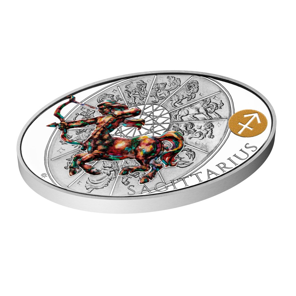 Medaile netradičního oválného tvaru nese na reverzní straně kolorované vyobrazení Střelce. Jako předloha pro kolorování nebyly použity fotografie nebo počítačová grafika – medailér Asamat Baltaev, DiS., vytvořil originální akvarelovou malbu. Reliéf v pozadí předkládá disk s tuctem znamení zvěrokruhu a kompozici dotváří ještě latinský opis SAGITTARIUS s příslušným astrologickým symbolem. Hvězdné symboly jednotlivých znamení najdete i na reverzní straně medaile, která je společná celé sérii.