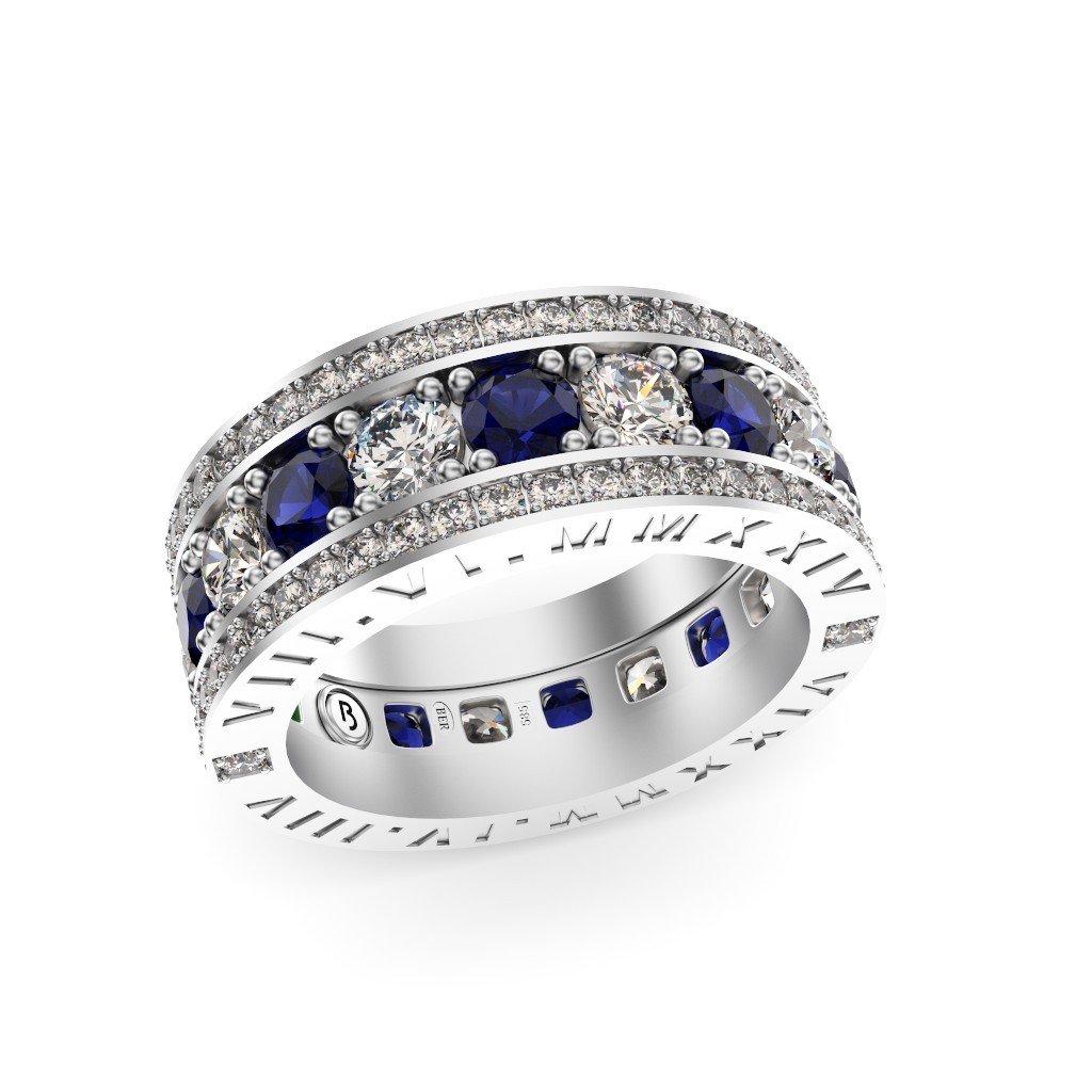 Prsten z bílého zlata s růžovými safíry a přírodními diamanty briliantového brusu.